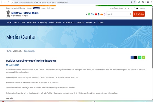 In a statement, the External Affairs Ministry said, all Pakistani nationals currently in India must leave the country before the set deadline for visas. It has also advised Indian nationals to avoid travelling to Pakistan, and those Indians currently in Pakistan have also asked to return to India at the earliest.