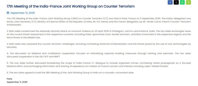 According to media sources, India and France have condemned the ghastly terror attack in Pahalgam in April this year. Both sides exchanged views on the current threat assessment in the respective countries at the 17th Meeting of the India-France Joint Working Group (JWG) on Counter Terrorism (CT) held in France. The Indian delegation was led by Joint Secretary, Counter Terrorism at the Ministry of External Affairs, K D Dewal, while the French delegation was led by French Counter-Terrorism Ambassador Olivier Caron.