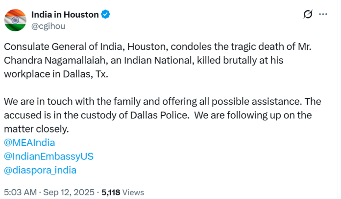 According to media sources, An Indian national, Chandra Nagamallaiah, was tragically killed at his workplace in Dallas, Texas, in a shocking act of violence. The Consulate General of India in Houston confirmed the incident on a social media platform and expressed condolences to the victim’s family. The Consulate General of India said that the accused is in custody and they are following up on the matter closely.