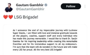 गौतम गंभीर ने अपने सोशल मीडिया एक्‍स पर लिखा- ‘मैं लखनऊ सुपर जायंट्स के साथ अपने स्फर को समाप्त करने का ऐलान करता हूं। ऐसा करते हुए मैं सभी खिलाड़ियों, कोच, सपॉर्ट स्टाफ और हर कोई इस यादगार सफर में मेरे साथ रहा उनका मैं आभार व्यक्त करना चाहता हूं। मैं डॉक्टर संजीव गोयनका और उनकी प्रेरणादायी लीडरशिप का भी शुक्रिया अदा करता हूं। मुझे उम्मीद है कि यह टीम भविष्य में कमाल करेगी और लखनऊ सुपर जायंट्स के फैन्स को गर्व महसूस करवाएगी। LSG ब्रिगेड को बहुत बहुत बधाई।