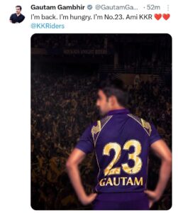 गंभीर 2011 से 2017 के बीच कोलकाता नाइट राइडर्स के साथ थे। उन्हीं की कप्तानी में कोलकाता नाइट राइडर्स ने दो बार खिताब जीता था। गंभीर ने अपनी वापसी पर कहा, ‘मैं आम तौर पर भावनाओं में नहीं बहता हूं लेकिन यह भावना थोड़ी अलग है। यह वहीं पहुंचने जैसा है जहां से सब शुरू हुआ था। उस आइकॉनिक पर्पल और गोल्डन जर्सी को देखकर मैं जुनून से भर गया हूं और मेरा गला भर आया है। मैं सिर्फ केकेआर दोबारा जॉइन नहीं कर रहा हूं। मैं सिटी ऑफ जॉय में वापस आ रहा हूं। मैं लौट आया हूं। मैं भुखा हूं। मेरा नंबर 23 है। आमी केकेआर।