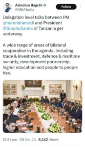 तंजानिया की राष्ट्रपति सामिया सुलुहू हसन राष्ट्रपति द्रौपदी मुर्मू के निमंत्रण पर भारत की तीन दिवसीय यात्रा पर हैं। वह 8 अक्टूबर को नई दिल्ली पहुंची थीं। इससे पहले उनका राष्ट्रपति द्रौपदी मुर्मू ने राष्ट्रपति भवन में औपचारिक स्वागत किया। मीडिया की माने तो, प्रधानमंत्री नरेंद्र मोदी ने सोमवार को तंजानिया की राष्ट्रपति सामिया सुलुहू हसन के साथ द्विपक्षीय वार्ता की।